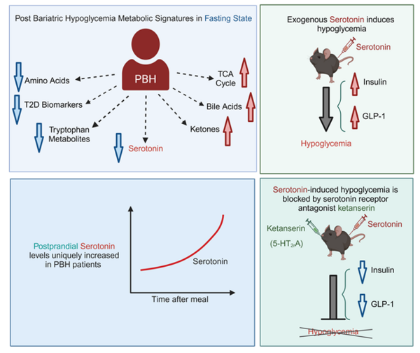 Congrats to postdoctoral fellow Rafael Ferraz-Bannitz and the entire team on the publication of our paper in Journal of Clinical Investigation (2024)! We identify alterations in serotonin-dependent signaling as a potential contribution to post-bariatric hypoglycemia. We thank the entire research team and our volunteers who give so generously of their time and blood samples to find new approaches to treat hypoglycemia! We are hoping to begin translating these findings, but are awaiting decisions regarding research funding! The PDF is posted below.