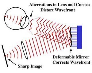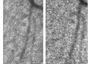 The picture below shows the before (left) and after (right) adaptive optics aberration correction on living human retina. Individual photoreceptor cell (~3µm) is well resolved with the help of adaptive optics.