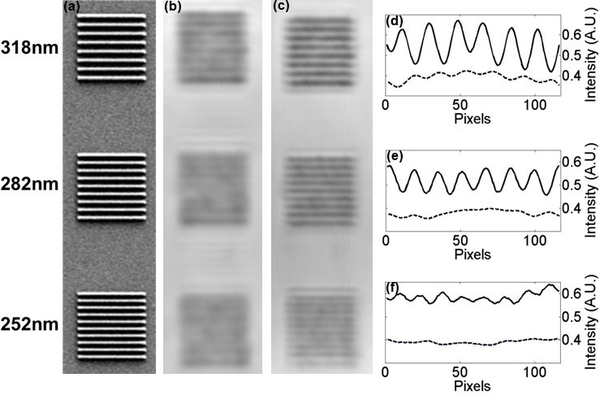 Comparison before and after applying + 190 nm RMS first order spherical aberration correction. (a): SEM image showing the region of interest. (b): aSIL microscope image obtained before spherical aberration correction. (c): aSIL microscope image obtained afterspherical aberration correction. (d): Line cut comparison on group 318 nm. (e): Line cut comparison on group 282 nm. (f): Line cut comparison on group 252 nm.