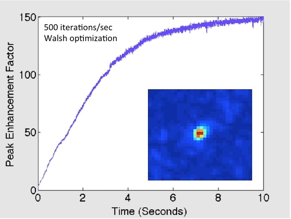 were used to maximize the intensity at a single point in the downstream plane. Intensity enhancement by factors of several hundred were achieved within a few thousand iterations using a MEMS segmented deformable mirror (e.g. a spatial light modulator) with 1020 independent segments.
